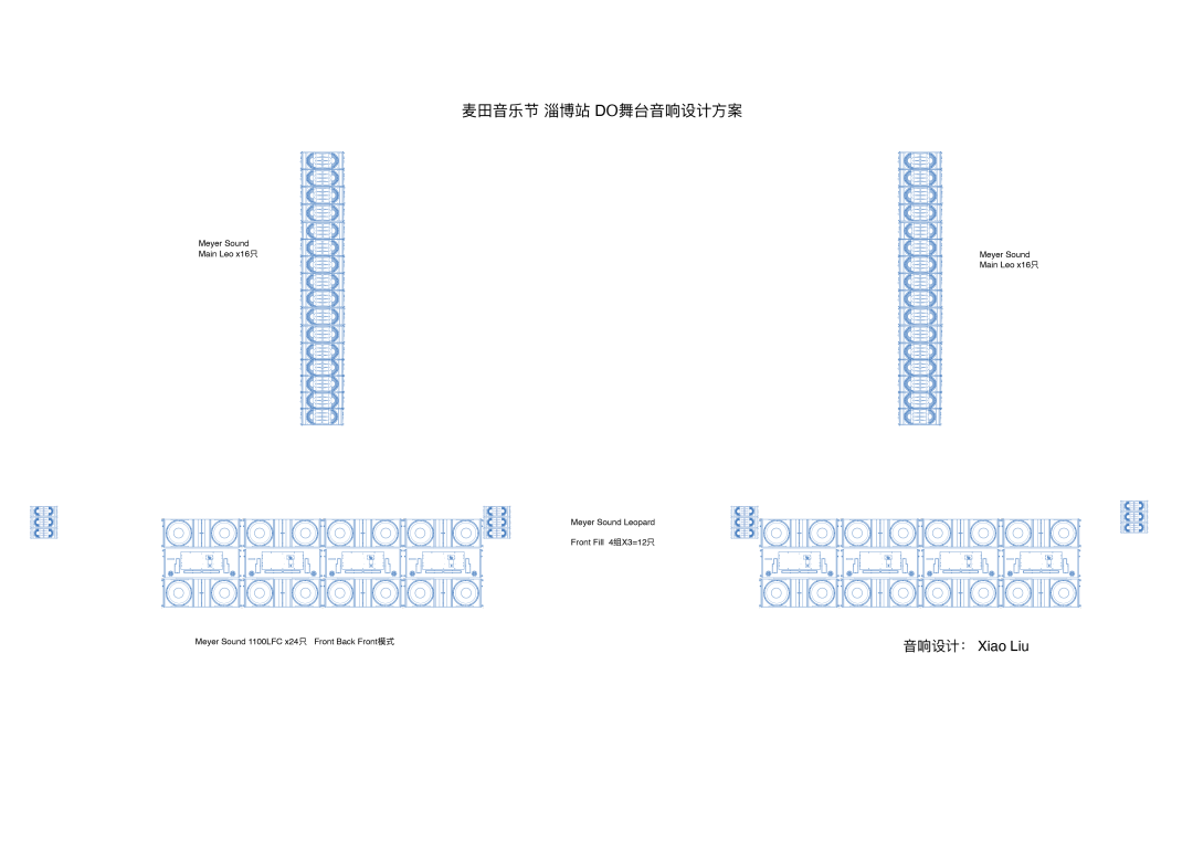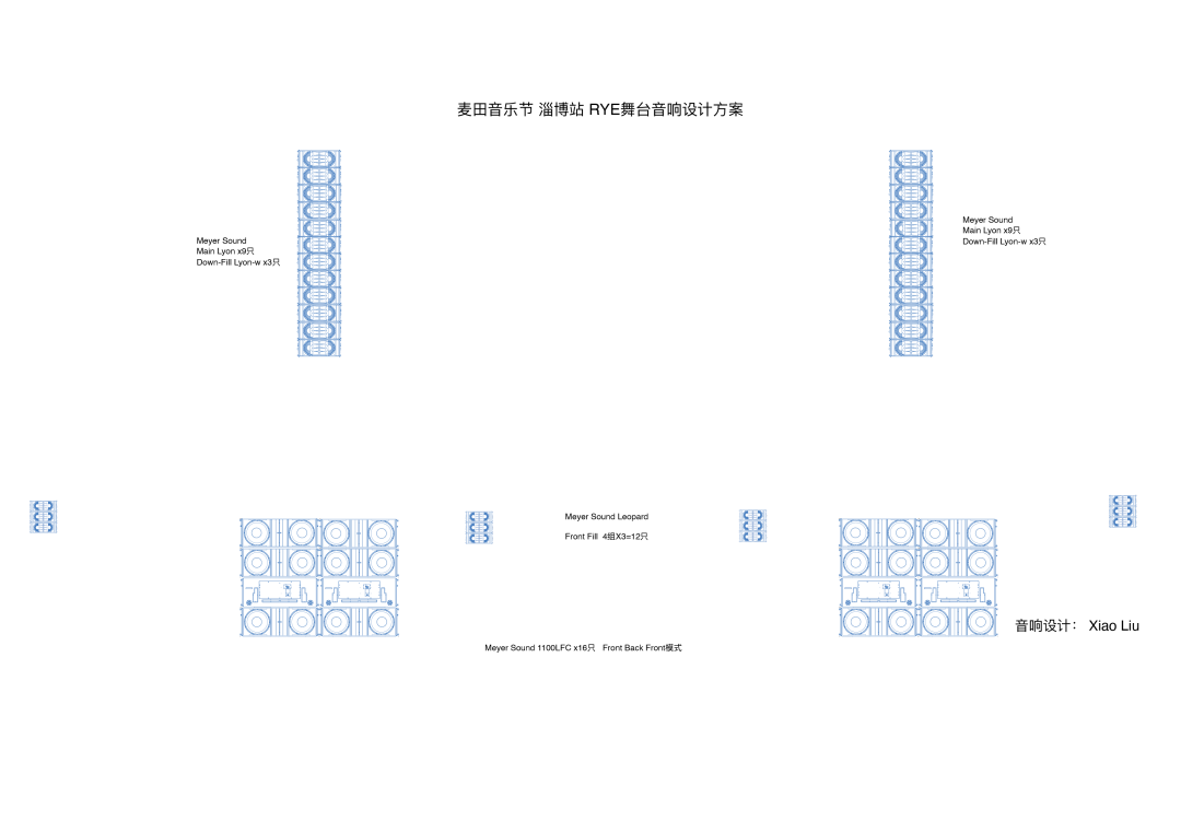 RYE舞臺作為副舞臺,主喇叭采用每側(cè)12只共計24只Lyon。前區(qū)補聲采用共4組共12只Leopard,低音部分由4組1100-LFC 超低頻陣列組成。