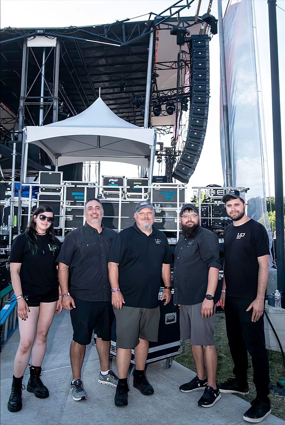 從左到右:FOH 調(diào)音師 Carolyn Slothour; UPscale 老板 Chris Lambert ; 監(jiān)聽工程師 Perry Comeaux; 音頻團(tuán)隊(duì)負(fù)責(zé)人 Brandon Abshire; 系統(tǒng)工程師 Michael Lawrence