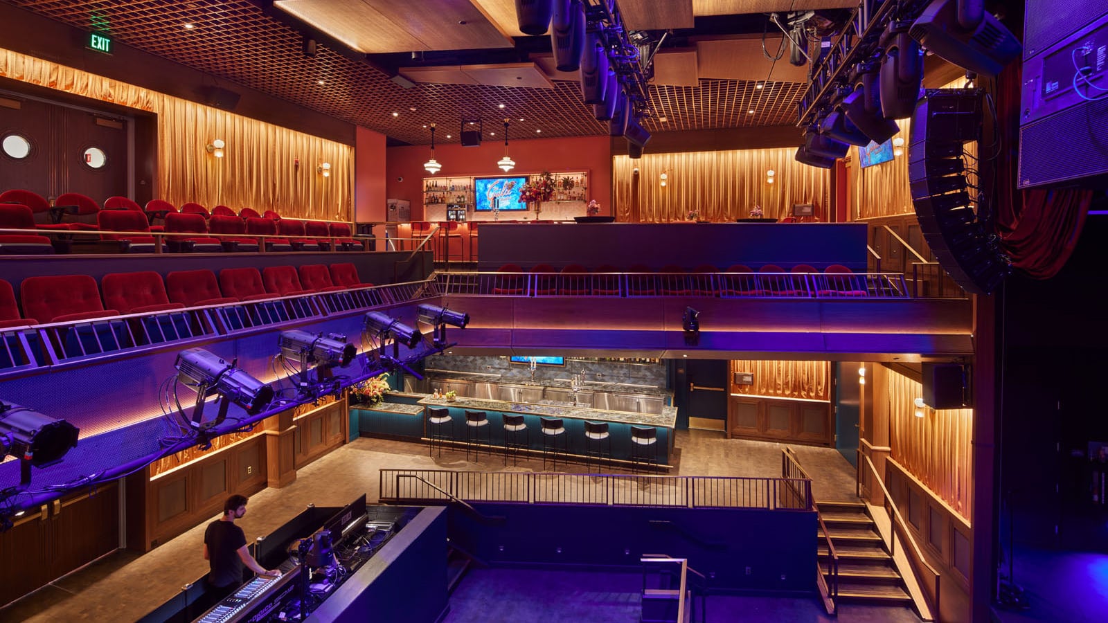 系統(tǒng)設(shè)計(jì)幾經(jīng)改進(jìn),最終的系統(tǒng)配置主擴(kuò)由左右兩組 LINA 緊湊型線性線陣列音箱組成,每組各 7只,兩組陣列各搭配 1 只吊掛的 750-LFC 緊湊型低頻控制單元。3 只 1100-LFC 低頻控制單元組成中置心形陣列,加上配置在舞臺(tái)下方另外 2 只 750-LFC 一起提供強(qiáng)勁的低音。另外,還配備了 4 只 ULTRA?X20, 2 只  ULTRA?X42 以及 8 只 Ashby-8C 音箱分別用于覆蓋觀眾前區(qū)、VIP區(qū)域以及用作吧臺(tái)區(qū)補(bǔ)聲。配置在主觀眾區(qū)的 6 只 HMS-10 音箱和用于覆蓋樓座的 4 只HMS-5 音箱組成環(huán)繞聲系統(tǒng),同時(shí)支持杜比 7.1 影院放映模式和 Spacemap Go 空間聲音設(shè)計(jì)和混音工具。至于藝人返送系統(tǒng),Guild 劇院則為其配置了 8 只 MJF-210 小型大功率舞臺(tái)監(jiān)聽音箱,另加 1 只750-LFC 用于支持鼓低音。