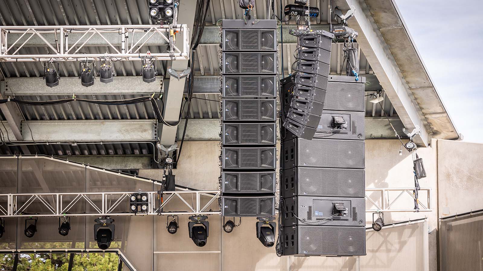 丹佛 Levitt Pavilion 主擴系統(tǒng)由左右各 8 只吊掛的 PANTHER 音箱組成,每組上部分為 6 只覆蓋角度較窄的 PANTHER-L,下部分則是 2 只覆蓋較寬的 PANTHER-W。側(cè)面各吊掛 8 只 LINA 緊湊型線性線陣列音箱,外加 3 只 LINA 音箱用于中置補聲。另配 12 只 1100-LFC 低頻音箱提供強勁的低音,1 臺 GALAXY 816 和 2 臺 GALAXY 408 網(wǎng)絡平臺處理器提供系統(tǒng)驅(qū)動和優(yōu)化。每個 PANTHER 音箱通過基于 Milan 協(xié)議的 AVB 網(wǎng)絡直接連接到 GALAXY 處理器。該系統(tǒng)由丹佛制作服務有限公司 (PSI) 提供,并將在整個演出期間供所有演出活動(免費或收費)使用。