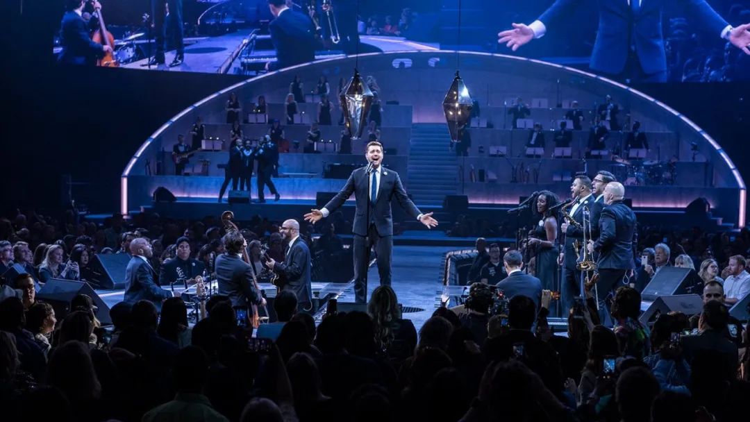 這一次的新功能是引入了 Spacemap Go 空間音頻設(shè)計(jì)和現(xiàn)場(chǎng)混音工具,當(dāng) Michael Bublé在兩個(gè)舞臺(tái)之間漫步時(shí),它可以平滑透明地跟蹤 Bublé 的聲音,在所有座位上保持精確的聽(tīng)覺(jué)定位,并在多個(gè)揚(yáng)聲器陣列中進(jìn)行同步,逐級(jí)改變電平和延遲。