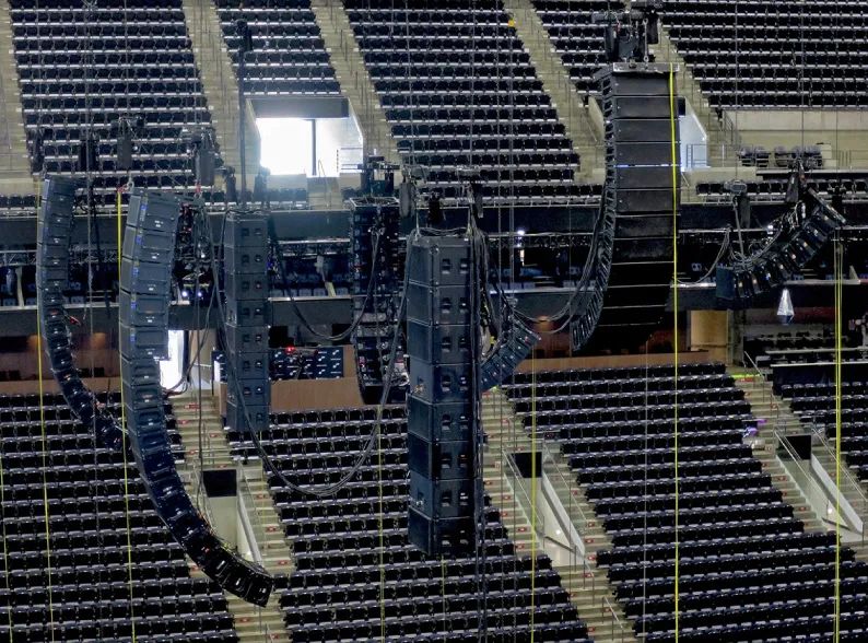 當(dāng) Bublé 在主舞臺(tái)上時(shí),中央吊掛的陣列充當(dāng)一個(gè)巨大的延時(shí)陣列,并在他移動(dòng)到 B舞臺(tái)時(shí)成為主要系統(tǒng)。該系統(tǒng)包括 10 個(gè) LEO 和 52 個(gè) MICA 線(xiàn)陣揚(yáng)聲器,以及面向舞臺(tái)的陣列,其中 16 個(gè) LEOPARD 線(xiàn)陣揚(yáng)聲器僅在 Bublé 位于B舞臺(tái)下方時(shí)才啟用。B舞臺(tái)系統(tǒng)還包括 12 個(gè) 700-HP 低音炮、兩個(gè) 900-LFC 元件和七個(gè)用于前置補(bǔ)聲的 MINA 揚(yáng)聲器。與十多年以來(lái)一樣,Bublé 巡演系統(tǒng)由 Solotech 提供。