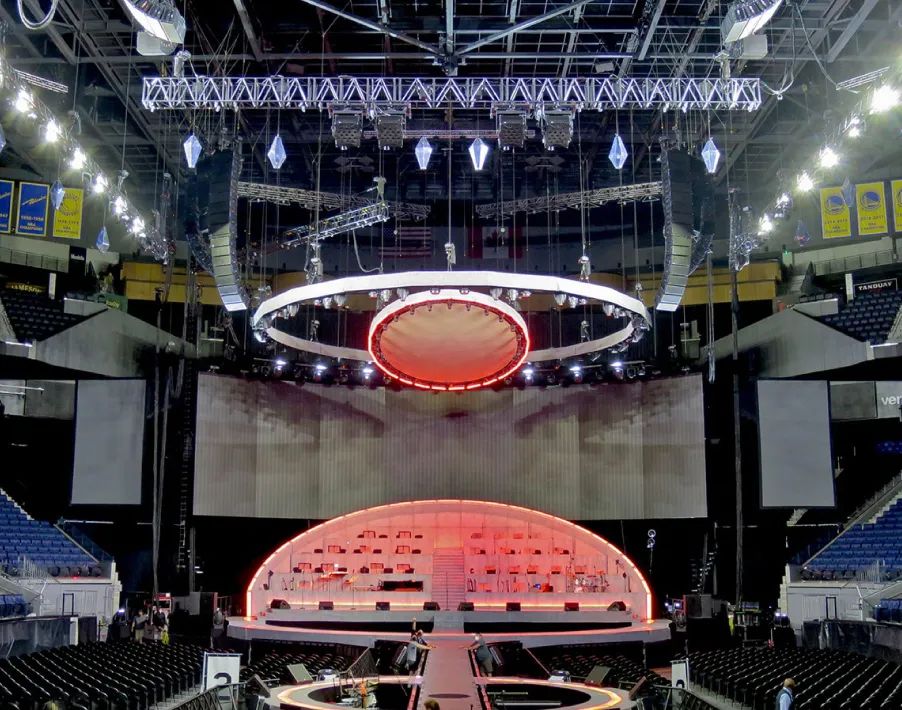 “Michael Bublé之夜”的北美巡演于 8 月恢復(fù),到 10 月下旬,在A級(jí)競(jìng)技場(chǎng)上舉辦了 23 場(chǎng)演出,吸引了眾多粉絲。巡演一如既往地由全球知名的制作公司 Solotech 提供Meyer Sound 擴(kuò)聲系統(tǒng),并且這個(gè)龐大的系統(tǒng)再次部署在一種新穎的“雙混合”配置中,包括典型的后級(jí)陣列和在B舞臺(tái)作為基本功能的中央吊掛陣列組成一個(gè)全面的系統(tǒng)。