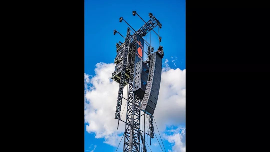 其它新的技術(shù)方案還包括在Orange舞臺實施創(chuàng)新的低音陣列,和減少Gloria舞臺的中低頻滲透?!拔覀兏纳屏巳ツ甑某晒儆糜诮衲瓴⑷〉昧擞幸饬x的進(jìn)展。去年,我們使用常規(guī)的吊掛end-fire低音陣列,“Meyer Sound歐洲支持部門的高級技術(shù)Dennis Tholema介紹說?!敖衲?,它是一個漸變式的end-fire低音陣列,向上交錯并向下轉(zhuǎn)向,以便能夠在舞臺和后臺獲得最大的抵消,這是制作組的愿望。我們(在舞臺低頻部分)實現(xiàn)了約17dB的下降。所以舞臺上非常非常安靜。在Gloria舞臺,我們在每個線陣列后面使用了兩個頻段限制的UPQ-1P進(jìn)行梯度設(shè)置,以減少陣列對舞臺上的中低頻滲透。”