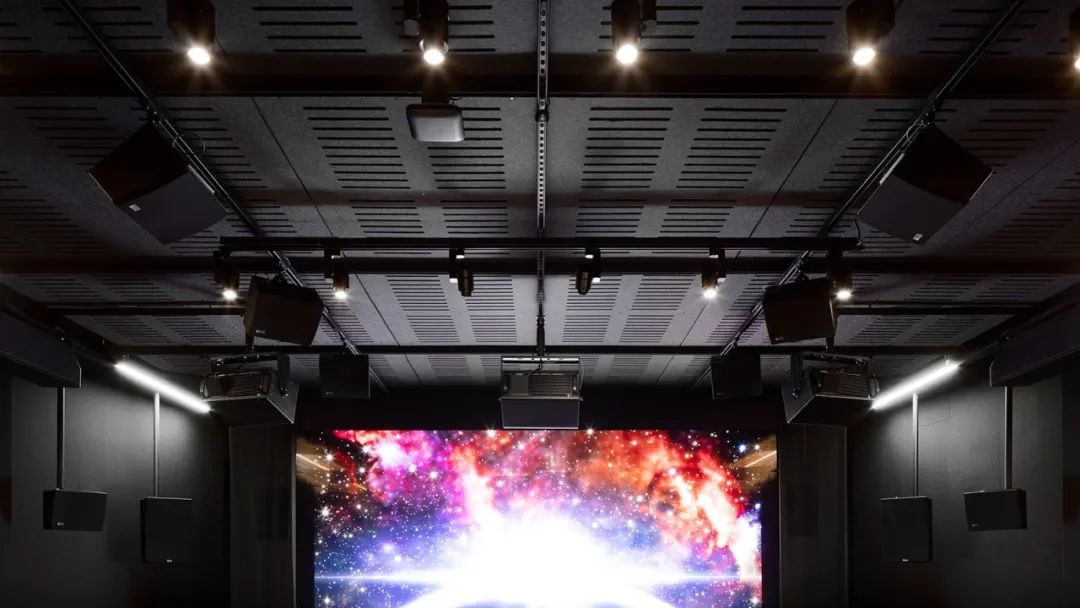 創(chuàng)新的屏幕通道是完整的杜比全景聲系統(tǒng)的一部分,該系統(tǒng)帶有可快速調(diào)用的快照,適合影院或 9.1.6 家庭娛樂播放模式。系統(tǒng)包括總共 37 個自供電的 Meyer Sound 影院揚聲器,包括HMS系列側(cè)邊和頭頂環(huán)繞揚聲器,這些揚聲器配合USW-210P?低音揚聲器使用,用于環(huán)繞低音管理,X-400C?影院低音揚聲器具有VLFC?極低頻低音管理和LFE的控制元件。