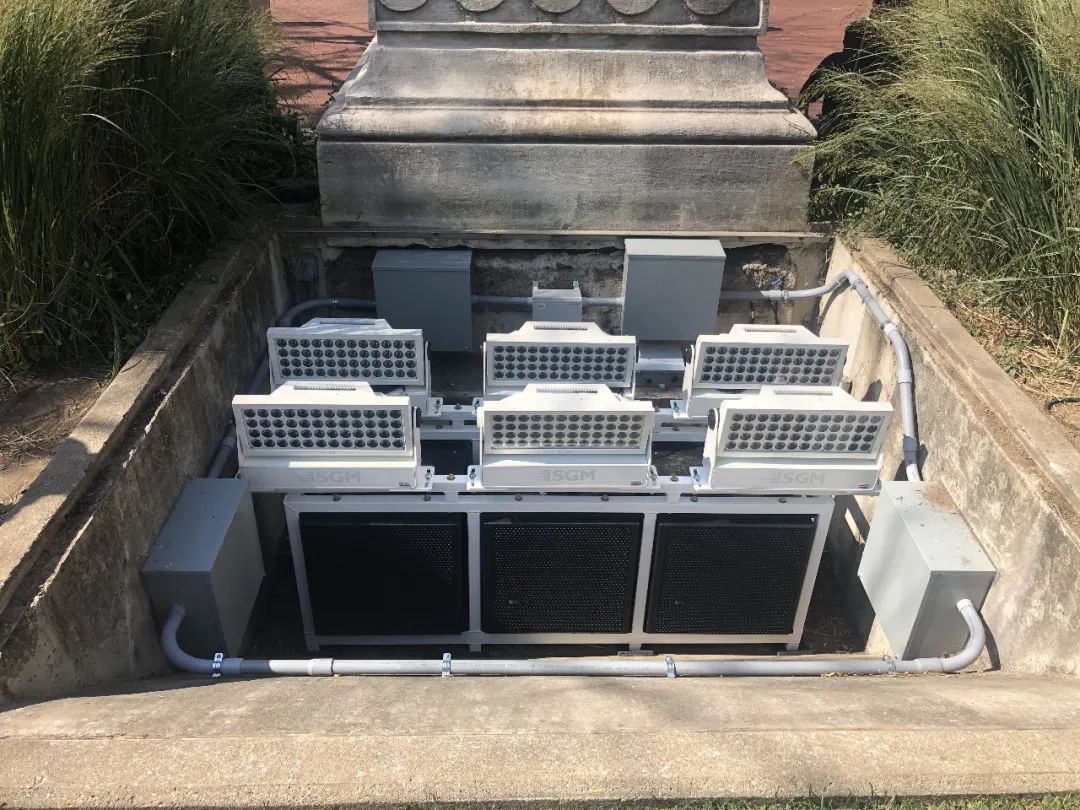 Dodd技術(shù)公司的系統(tǒng)設(shè)計(jì)師和項(xiàng)目經(jīng)理Caleb Cassler評(píng)論道:“紀(jì)念碑廣場(chǎng)周?chē)鷱穆晫W(xué)角度提出了多種挑戰(zhàn)。凹形的建筑正面四周環(huán)繞著一個(gè)非?;祉懙目臻g,混響時(shí)間長(zhǎng)達(dá)三秒鐘,沿著小巷散布著許多旅館和公寓樓。因此,用均勻,高沖擊力的聲音填充圓圈需要非常精確的控制?!?/p>