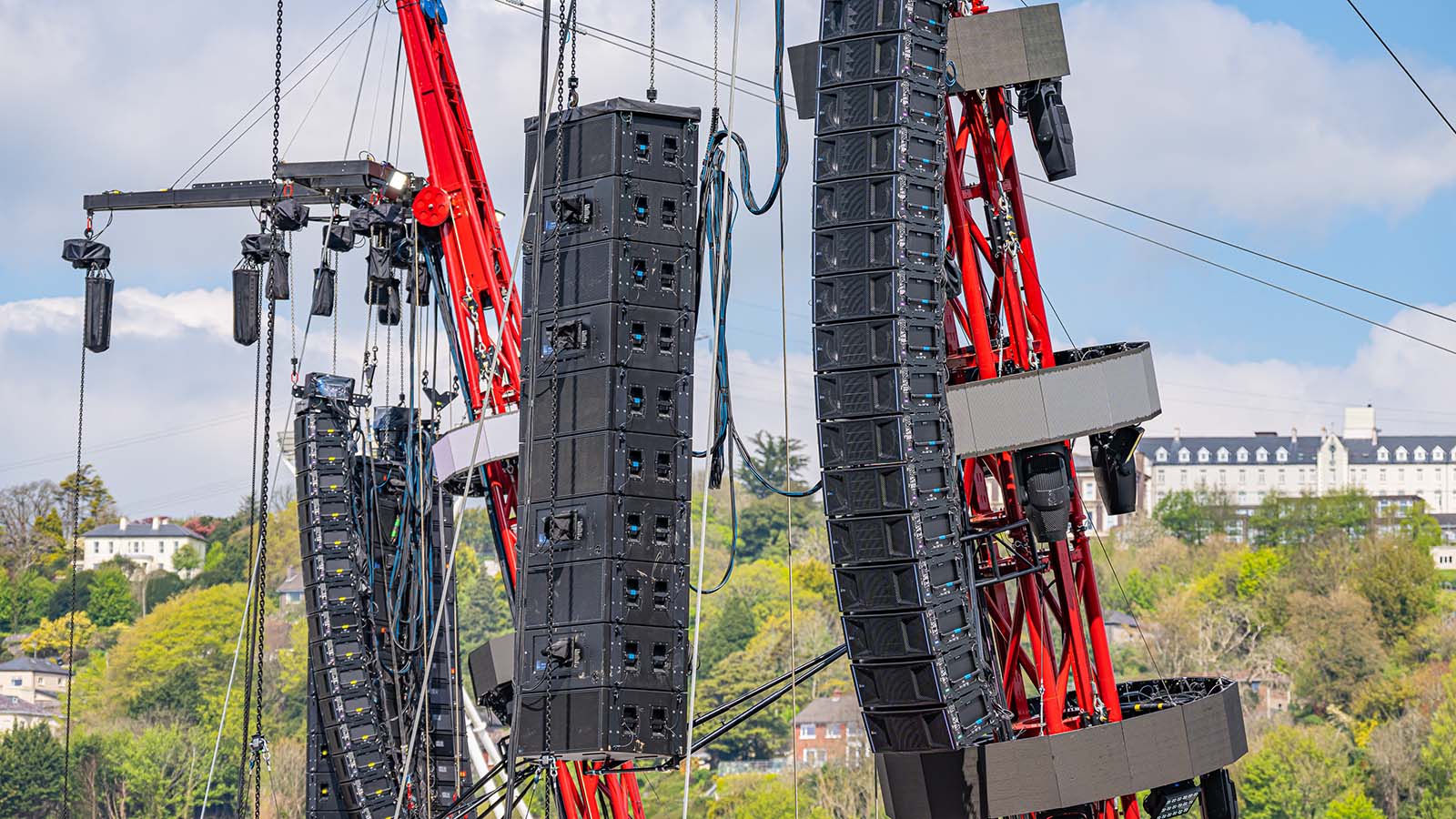 為了支持此次 Croke 公園的演出,該系統(tǒng)通過(guò)14 組吊掛的 PANTHER 陣列組成兩個(gè)環(huán)形。其中 6 組內(nèi)圈陣列每組采用了“L”長(zhǎng)距離投射型和 “M”集中投射型的組合,8 組外圈陣列每組各包括 “L”型、“M”型和“W”寬覆蓋型的組合。三種號(hào)角類(lèi)型的音箱分散配置,使系統(tǒng)設(shè)計(jì)人員能夠根據(jù)實(shí)際調(diào)整覆蓋范圍,使不同距離的區(qū)域都有均勻的聲壓級(jí)和一致的頻率響應(yīng)。