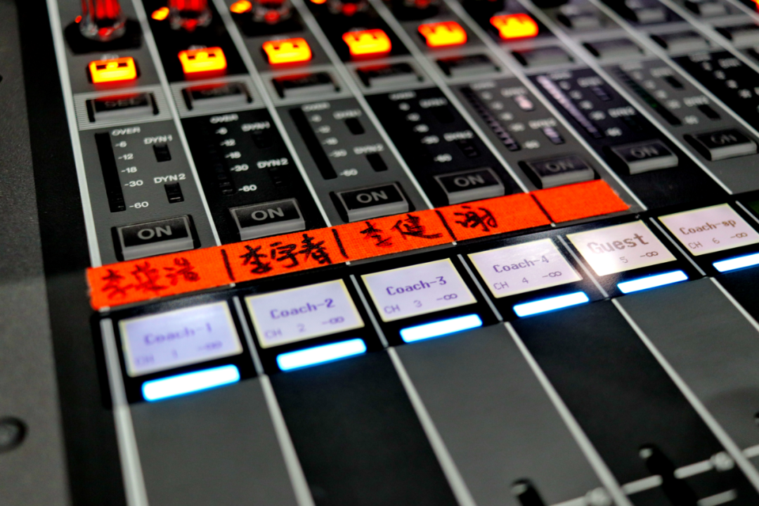 區(qū)分導(dǎo)師名字的便簽條——在現(xiàn)場(chǎng)調(diào)音師圈子里,工作的時(shí)效性是非常重要的,調(diào)音師需要以極高的效率隨時(shí)滿(mǎn)足包括導(dǎo)演、導(dǎo)師、歌手以及觀(guān)眾在內(nèi)的眾多不斷變化的聽(tīng)音需求,雖然都是對(duì)聲音的塑造,但就這一特點(diǎn)來(lái)說(shuō)現(xiàn)場(chǎng)調(diào)音師和錄音師的需求就大不相同。就像 EFFECT 一定要縮寫(xiě)為 FX 一樣,對(duì)于現(xiàn)場(chǎng)調(diào)音師來(lái)說(shuō),為導(dǎo)師分配的通道名稱(chēng)的便簽條標(biāo)注也要盡可能寧簡(jiǎn)勿繁,只是本季的四位導(dǎo)師有三位同姓,因此造成畫(huà)面中的有趣現(xiàn)象。