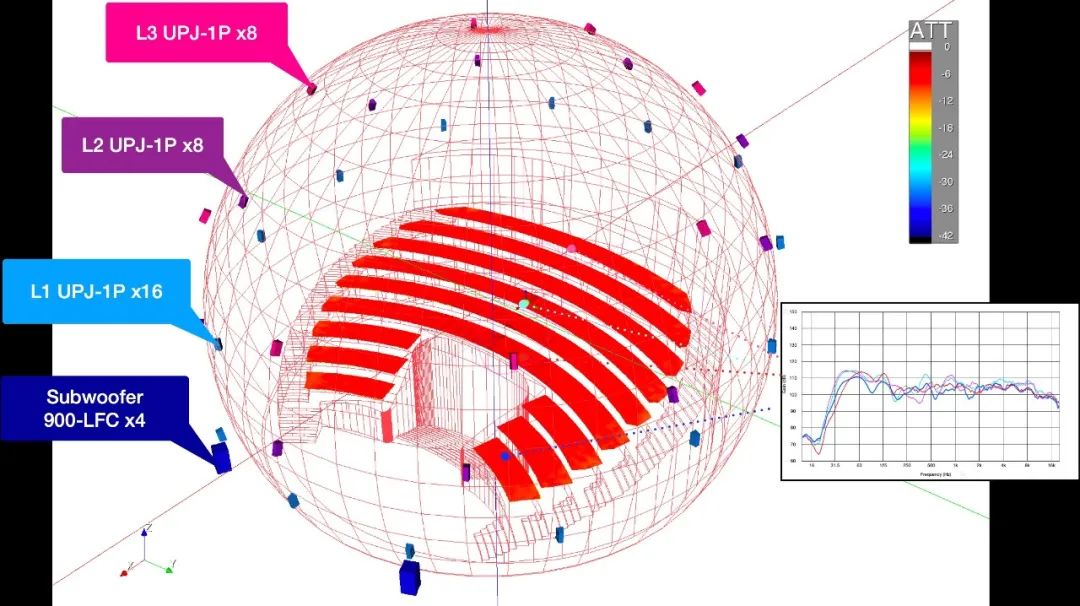 8K球幕影院使用32只UPJ-1P全頻揚聲器和4只900-LFC超低頻揚聲器共同構(gòu)成多聲道系統(tǒng)。我們使用Meyer Sound MAPP 3D軟件來模擬整個聲場的覆蓋,確保整個被覆蓋區(qū)域都可以得到優(yōu)質(zhì)的沉浸式的聆聽體驗。