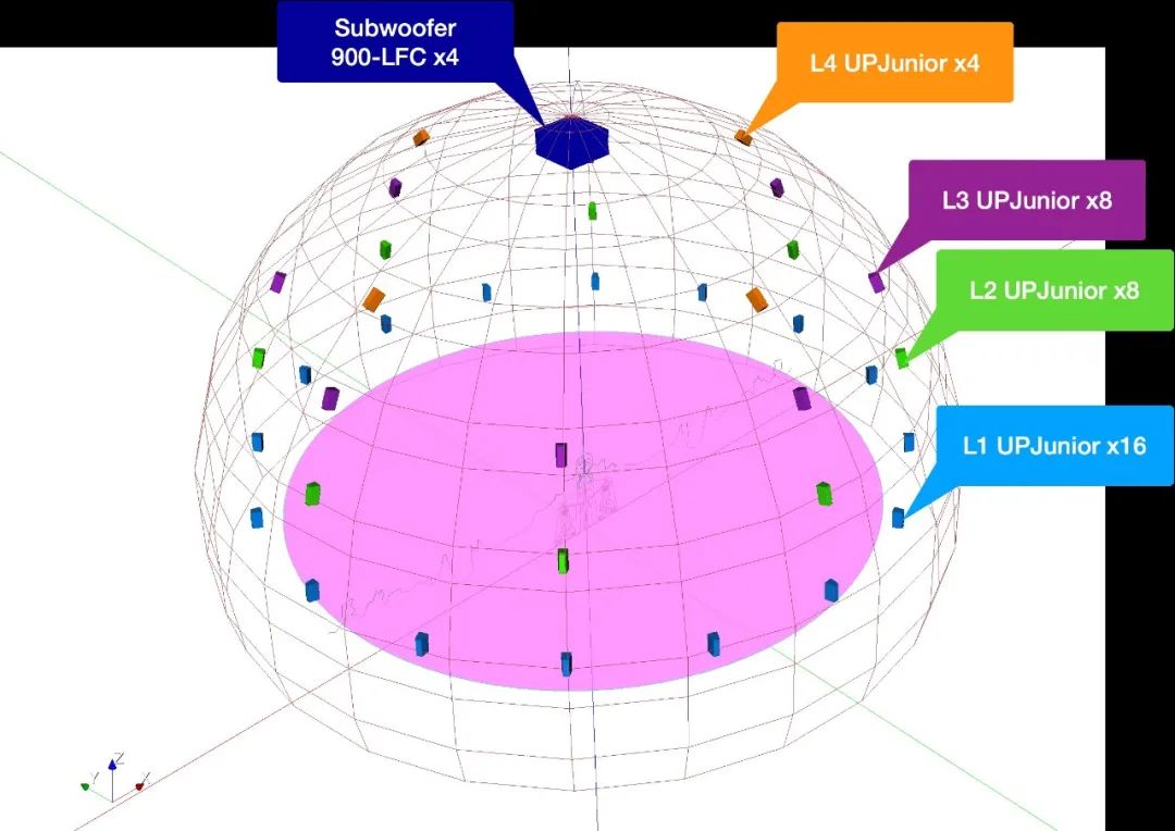 設(shè)計使用36只UPJunior揚聲器分4層布置,全方位的還原整個球體的聲像。在球體頂部的中央設(shè)計4只900-LFC低頻揚聲器,作為獨立的超低頻通道,擴展音頻回放頻段的下限,全頻段地還原音頻制作團隊所創(chuàng)作的聲效,給觀眾帶來無與倫比的視聽體驗。