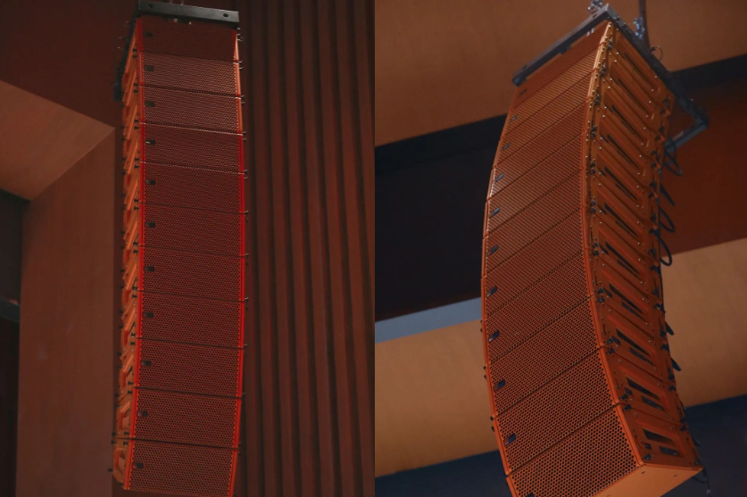 YOUNG劇場左右聲道每組各使用了11只 Meyer Sound LINA 雙6.5英寸緊湊型線陣列揚聲器明裝于舞臺臺框兩側,整組揚聲器能完整覆蓋池座及樓座全場觀眾區(qū)域,并且整組箱體顏色根據劇場環(huán)境定制,能完美的融入其裝修風格。中央聲道采用與左右主擴相同系列的7只 Meyer Sound LINA 暗裝于音橋內,擔負著向全場提供語音部分的重要任務,能夠覆蓋觀眾席全部區(qū)域。
