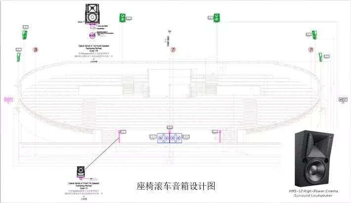 在設(shè)計(jì)階段,為完美表現(xiàn)劇目效果,設(shè)計(jì)團(tuán)隊(duì)決定采用多聲道沉浸聲系統(tǒng)。選型過程中與Meyer sound技術(shù)討論后確認(rèn)需要垂直覆蓋角度和水平覆蓋角度均為80°的點(diǎn)聲源作為主擴(kuò)聲最為合適,為此Meyer sound定制了UPQ-D3揚(yáng)聲器,并且根據(jù)不同的觀眾席模式精確設(shè)計(jì)了揚(yáng)聲器的吊掛位置及指向。超低頻方面,Meyer Sound團(tuán)隊(duì)針對性地設(shè)計(jì)了多組900-LFC心形指向低音陣列均勻覆蓋觀眾席,并在旋轉(zhuǎn)座椅下方的空間內(nèi)設(shè)計(jì)了X-800C低音揚(yáng)聲器,滿足劇目大動(dòng)態(tài)低音需求。在劇場最具特色的旋轉(zhuǎn)觀眾席一周設(shè)計(jì)了一組HMS-12環(huán)繞揚(yáng)聲器,觀眾席上空設(shè)計(jì)一組HMS-12頂部效果揚(yáng)聲器,以及每個(gè)觀眾座椅內(nèi)都定制了小型環(huán)繞揚(yáng)聲器,使觀眾置身于劇目之中,身臨其境去感受奇幻旅途。