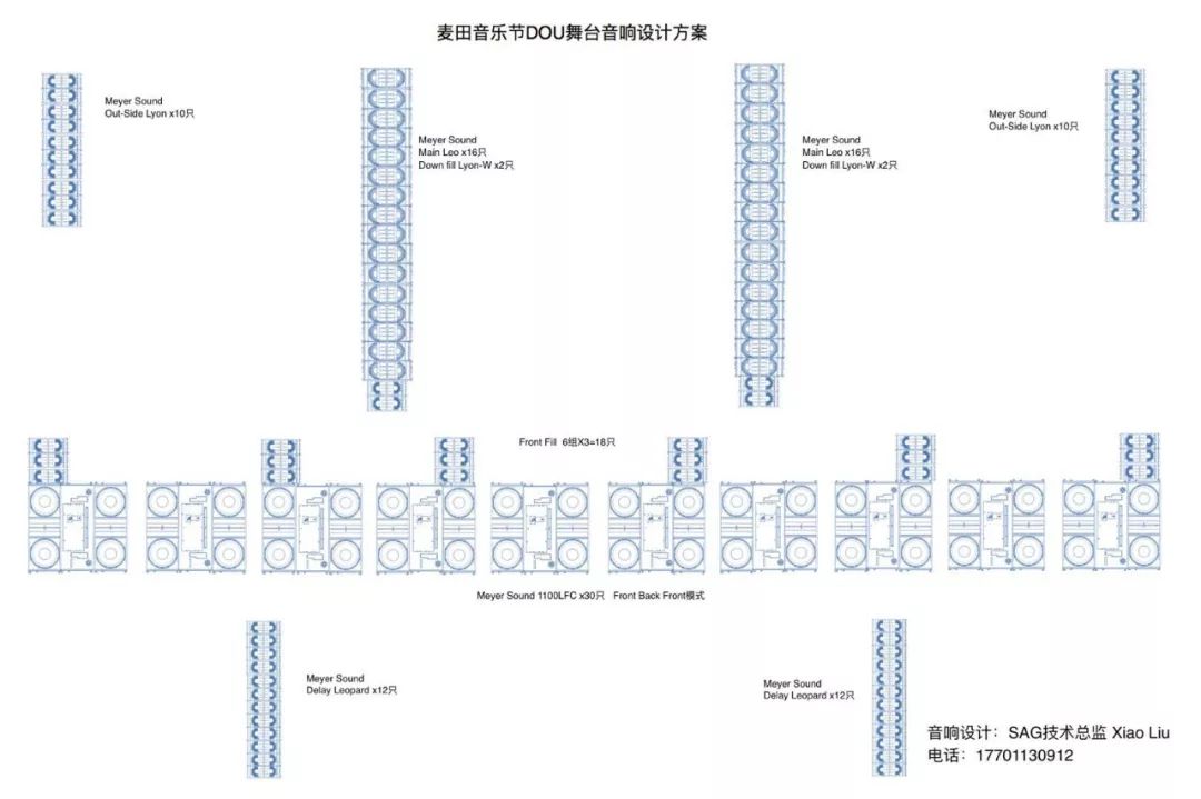 據(jù)S.A.G技術(shù)總監(jiān)兼PA駐場調(diào)音師小六老師介紹,DO舞臺作為主舞臺,主喇叭采用每組16只LEO+2只LYON-W;兩側(cè)補聲采用每側(cè)10只LYON-M,配套使用的Galaxy-816處理器添加了中低頻波束控制功能,能更好的控制中低頻段覆蓋的角度,延時補聲喇叭在距主擴70米左右,采用了2組每組12只 LEOPARD ,并使用了一臺Galileo616處理器單獨做處理,滿足山頂觀眾的舒適聽感;單獨使用了一臺Galileo616處理器驅(qū)動共計10組30只1100-LFC 超低頻陣列,每組3只1100-LFC(有一只反向擺放/反相加延時),每組超低喇叭給予不同的延時從而組成心形指向超低頻陣列,使得低音對舞臺上幾乎沒有影響;由于導(dǎo)演組的樂隊彩排時間安排在晚上進(jìn)行,而晚上9點以后現(xiàn)場禁止開大喇叭,于是在FOH調(diào)音臺前放著了2組 UPA-1P +900-LFC作為監(jiān)聽揚聲器,滿足調(diào)音師的調(diào)音需求;FOH有2套調(diào)音臺系統(tǒng),分別直接到Galaxy-816和Galileo616處理器,實現(xiàn)信號切換。