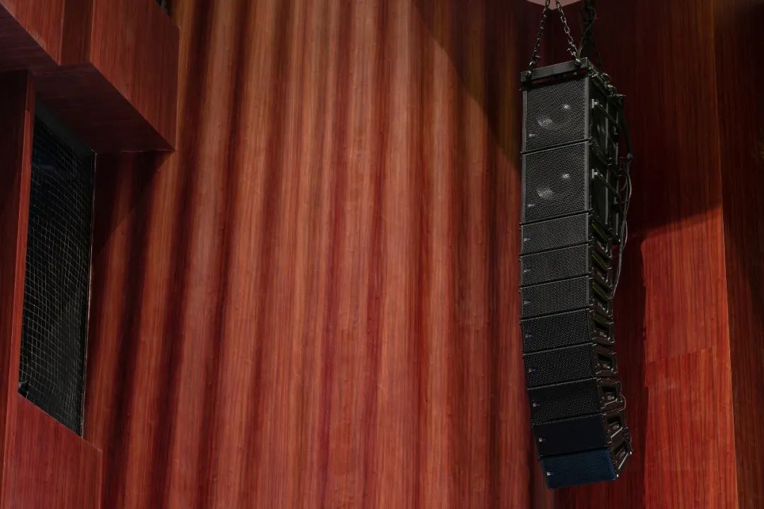 拉聲像UPQ-1P揚聲器可以作為主擴聲線陣列在垂直方向上覆蓋的補充,使聲場覆蓋更均勻,左右兩側各疊加放置兩只緊湊型雙音圈超低頻揚聲器900-LFC,臺唇及樂池補聲的選用上,我們充分考慮了原系統的尺寸,選用7只尺寸小巧UP-4XP服務臺唇以及9只UP-4XP服務于樂池,32只全頻環(huán)繞效果聲音箱UPJUNIOR以及4只天花效果揚聲器UPA-1P作為劇院內的環(huán)繞效果聲,滿足現代類話劇音樂劇等節(jié)目的音效需求。